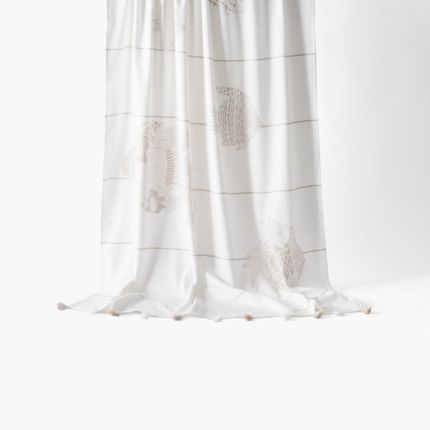 Світлий фон прикрашений витонченим візерунком у вигляді риб, що нагадує легкий морський бриз і прозорі хвилі. Акуратні пензлики по краях додають виробу грайливого акценту та ручної автентичності.