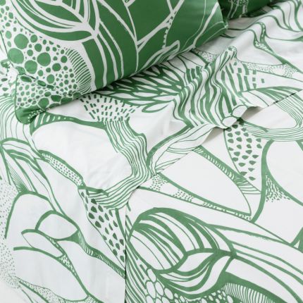 Знайдіть притулок у самому серці природи з лінією постільної білизни CANOPEE та її чудовим тропічним духом. Виготовлена з органічного бавовняного перкалю, щільністю 80 ниток/см², простирадло поєднує відповідальний склад і дуже стильні принти. Лідер весняно-літнього сезону.