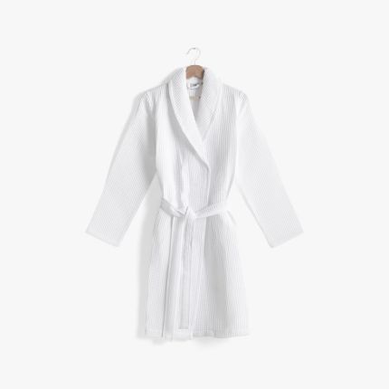 Жіночий вафельний халат CIRCLES з шалевим коміром бездоганного білого кольору спеціально розроблений для того, щоб супроводжувати вас все літо. Завдяки стільниковому плетиву цей аксесуар дуже швидко сохне. Ви оціните сучасний укорочений крій, внутрішні кишені та практичну петлю для ременя. Насолоджуйтесь чудовими моментами в цьому елегантному літньому халаті.
