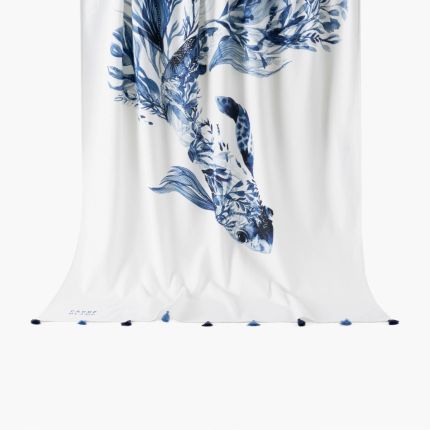 Пляжний рушник DEMILUNE від Carreblanc — це витончене поєднання мистецтва й комфорту, створене для літніх днів біля моря чи басейну. На білому полотні розгортається вишуканий акварельний малюнок у відтінках синього: рибка-коі, вплетена у водорості, ніби оживає серед хвиль, даруючи відчуття гармонії та легкості. Декоративні китички вздовж країв нагадують про гру морського бризу й додають виробу грайливих акцентів. Легка бавовняна тканина чудово вбирає вологу, швидко сохне й залишається приємною на дотик. Це не просто аксесуар, а справжня деталь стилю, яка зробить ваш відпочинок більш поетичним та елегантним.