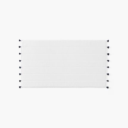 Килимок для ванної DEMILUNE поєднує практичність і витонченість. Виконаний з бавовни та віскози з бамбуку, він приємний на дотик, м’який і водночас стійкий до вологи. Лаконічний білий фон підкреслений декоративними пензликами темно-синього кольору по краях — деталь, що додає виробу характеру та завершеності.
