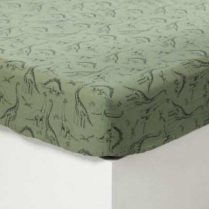 Простирадло на резинці DINOTOPI виготовлено з чистої органічної бавовни (57 ниток/см²) і має висоту бортика 30 см. Його екзотичний візерунок є начерками динозаврів, мінімалістичними і графічними суцільно на тлі кольору листя. Вирушайте в пригоду та змінюйте епохи завдяки цьому незвичайному комплекту постільної білизни!