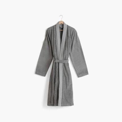 Чоловічий халат EQUINOXE відрізняється жакардовою смужкою з геометричним орнаментом. Халат Виконаний з бавовняної махрової тканини олов*яно-сірого кольору та має сучасний комір-кімоно. Дозвольте собі спокуситися вишуканою обробкою коміра.
