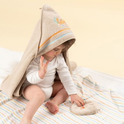 Капюшонні рушники — створені для найменших, щоб після купання малюка огорнули тепло та комфорт; капюшон оздоблений усміхненим крабиком.