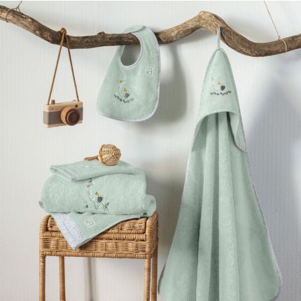 Набір для купання FESTINE, доступний у трьох вишуканих кольорах, є аксесуаром для першого купання дітей. Виготовлена з органічної бавовни, матеріалу, що дбайливо ставиться до шкіри та навколишнього середовища, ця постільна білизна для купання дитини переповнена ніжністю завдяки вишивці із зображенням тварин та принтованій обробці. Колекція для вишивання для подарунка на народження дитини, яка обов'язково сподобається.