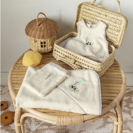 Набір для купання FESTINE, доступний у трьох вишуканих кольорах, є аксесуаром для першого купання дітей. Виготовлена з органічної бавовни, матеріалу, що дбайливо ставиться до шкіри та навколишнього середовища, ця постільна білизна для купання дитини переповнена ніжністю завдяки вишивці із зображенням тварин та принтованій обробці. Колекція для вишивання для подарунка на народження дитини, яка обов'язково сподобається.