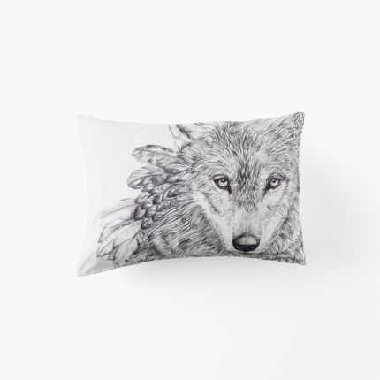 Прямокутна наволочка IETULOU від Carreblanc, виконана з м’якого перкалю (100% бавовна), вражає своїм подвійним декором. З одного боку — виразний малюнок вовка, що символізує силу та свободу, з іншого — графічний пейзаж хвойного лісу, який дарує відчуття спокою та гармонії. Стильний акцент для спальні, що поєднує дикість природи й затишок дому.