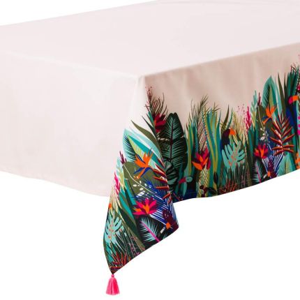 Скатертина для кухні JALAPAO з їїї екзотичним друком та яскравими кольорами, з яскравим фризом з пальм, квітів та екзотичних птахів на персиковому фоні прикрашена флуоресцентними рожевими помпонами по всій довжині з кожного боку. Гармонічно, коли її супроводжують відповідні серветки, щоб відкрити для себе кухонний набір JALAPAO.