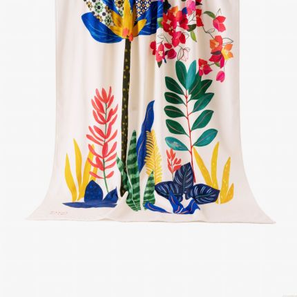 Пляжний рушник JARDIN M створений, щоб стати втіленням літнього відпочинку — м’який, великий і неймовірно яскравий. Виготовлений із бавовняного велюру, він поєднує в собі ніжність дотику та високу здатність вбирати вологу, даруючи комфорт після купання чи сонячних ванн. Його дизайн — справжня ода тропічній природі: насичені відтінки зелені, синього, рожевого та жовтого складають соковитий візерунок квітів і листя, який виглядає немов живий. Контрастні барви й динамічні форми перетворюють рушник на яскравий аксесуар, що прикрасить пляжний відпочинок і виділить свого власника серед натовпу. Логотип Carré Blanc, вишитий на тканині, підкреслює вишуканість виробу та його належність до французької традиції якісного текстилю.