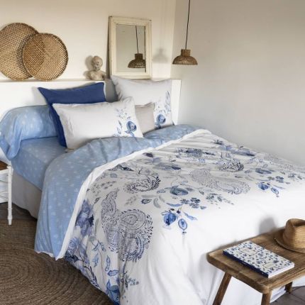 Прийміть декор заміського будинку з постільним комплектом MADELEINE та його абсолютно автентичним духом. Дозвольте собі спокуситись цією колекцією з деталями, натхненими майстерністю: тасьма, візерунки з кашеміру та випрані матеріали, доповнені відтінками ностальгічного синього. Завдяки подвійному декору варіюйте стилі оформлення за власним бажанням. Ідеальна прикраса, щоб принести в будинок чудову пору року.