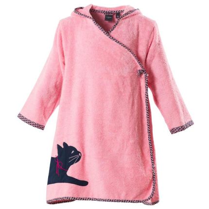 Махровий халат MANAROLA виготовлено з високоякісної натуральної бавовни, щільністю 400 г/м². В рожевому кольорі в стилі кімоно має приховану кнопку під декоративним бантом, декорований аплікацією кішки з чорної тканини. Дві практичні кишені заховані в бічних швах.