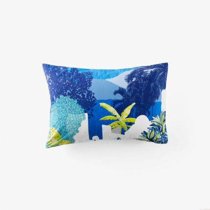 Прямокутна наволочка Naoussa занурює у світ Середземномор’я, де білі стіни будинків контрастують із глибиною синього моря та зеленню екзотичних рослин. Завдяки подвійній стороні декору ви можете обирати між динамічним пейзажем із архітектурними мотивами та більш спокійною композицією з ботанічними елементами. Виконана з високоякісної бавовни, наволочка поєднує м’якість і міцність, даруючи комфорт і свіжість у вашій спальні.