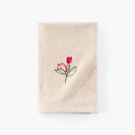 Основа рушника — теплий відтінок натурального бежу, що додає інтер’єру спокою та затишку. Центральний акцент — вишивка ніжного тюльпана у рожево-малиновій гамі з зеленим листям. Мінімалістичний мотив виглядає лаконічно та водночас створює естетичний акцент на кухні.