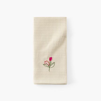 Акуратна вишивка тюльпана у рожево-малиновій гамі з зеленим листям додає ніжного акценту та робить рушник витонченим декоративним елементом. Контраст фактури та вишивки створює баланс між природною простотою та елегантністю.