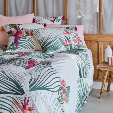 Підковдра PALMELIS від Carré Blanc створена, щоб наповнити спальню атмосферою тропічного відпочинку. На білому фоні розквітають екзотичні квіти та пальмове листя, серед яких виділяється яскравий червоний папуга — символ свободи та літа. Малюнок насичений, але водночас витончений, що дозволяє поєднувати підковдру як із простими однотонними, так і з яскравими аксесуарами. Виготовлена з натуральної бавовни, вона дарує комфорт, свіжість і легкість у щоденному використанні.