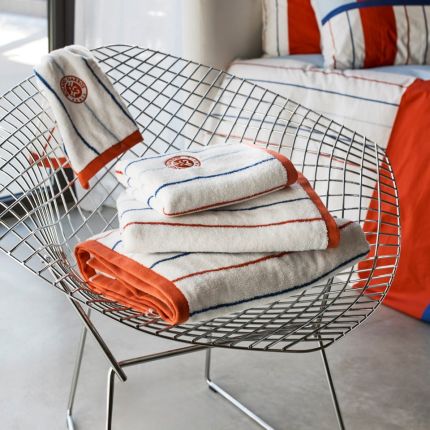 Колекція рушників Roland Garros Smash створена для тих, хто цінує динаміку, стиль і спортивний дух легендарного турніру. Їхній дизайн поєднує білий фон із контрастними синіми та помаранчевими смугами, що відсилають до кольорів кортів Ролан Гаррос. Завершує образ вишуканий акцент — фірмовий логотип турніру, вишитий з бездоганною точністю.