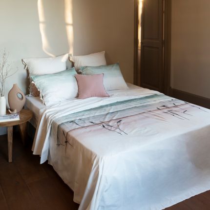 Простирадло VIBRATION спокушає своїм великим малюнком, виконаним у пастельних тонах у вигляді акварельної фрески. Це простирадло, виготовлене з натурального бавовняного перкалю, щільністю 80 ниток/см², має друкарську сторону з чудовими заспокійливими кольоровими градаціями і просте ванільне виворот. Викликаючи м'якість світанку, ця постільна білизна – справжнє запрошення до медитації, щоб відключитися від повсякденного життя.