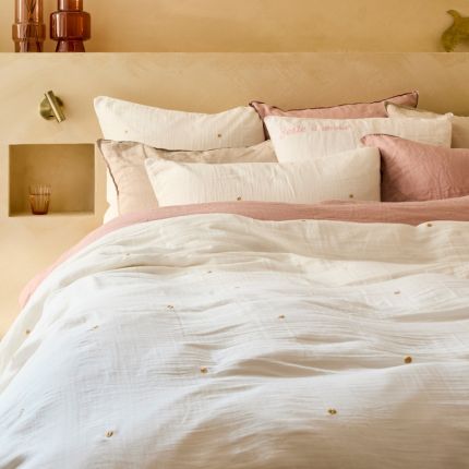 Підковдра ZEPHIRE виготовлена з м’якої бавовняної муслінової тканини, що дарує відчуття ніжності та легкості. Лаконічний дизайн у кольорі айворі прикрашений делікатною вишивкою золотих сердечок, які створюють атмосферу затишку та романтики. Завдяки натуральному матеріалу підковдра забезпечує комфортний мікроклімат у будь-яку пору року — прохолоду влітку та тепло взимку. Ідеальне рішення для тих, хто цінує естетику у деталях та природну м’якість.